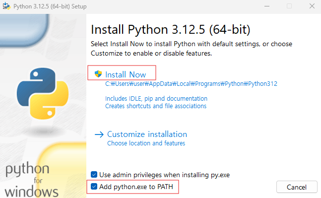 3. 설치 시 Add python.exe to PATH 반드시 체크하기