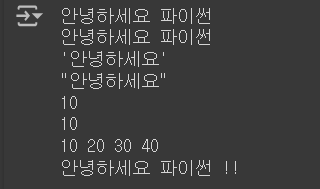print('파이썬 출력하기') # 문자열 출력은 작은따옴표 또는 큰따옴표를 사용